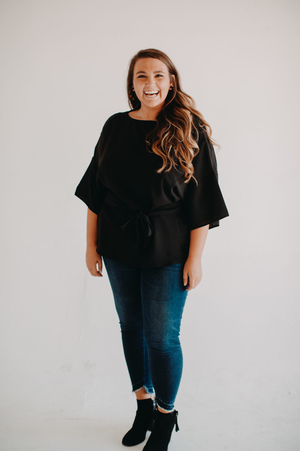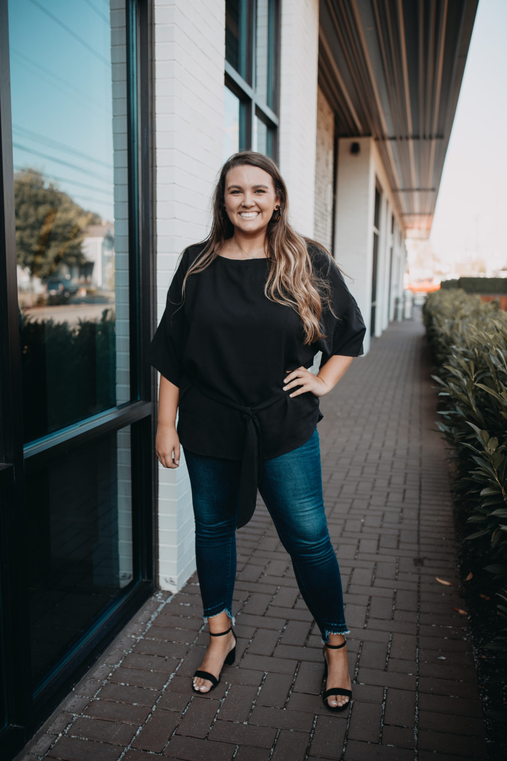 Here’s a closet staple that can be worn casual with jeans or dressed up with slacks or a skirt. The tie highlights your itty bitty waist, sis!